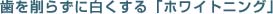 ホワイトニングとは、健康な歯を削らずに歯を白くする方法です。もともとわずかに黄ばんだ色をしていたり、飲食による着色、神経をとった後に歯が黒ずんでしまった、など原因は様々です。主に、歯科医院のみで行うオフィスホワイトニングと、おもに家庭で道具を使って行う、ホームホワイトニングに分けられます。当院ではホームホワイトニングをおすすめしています。